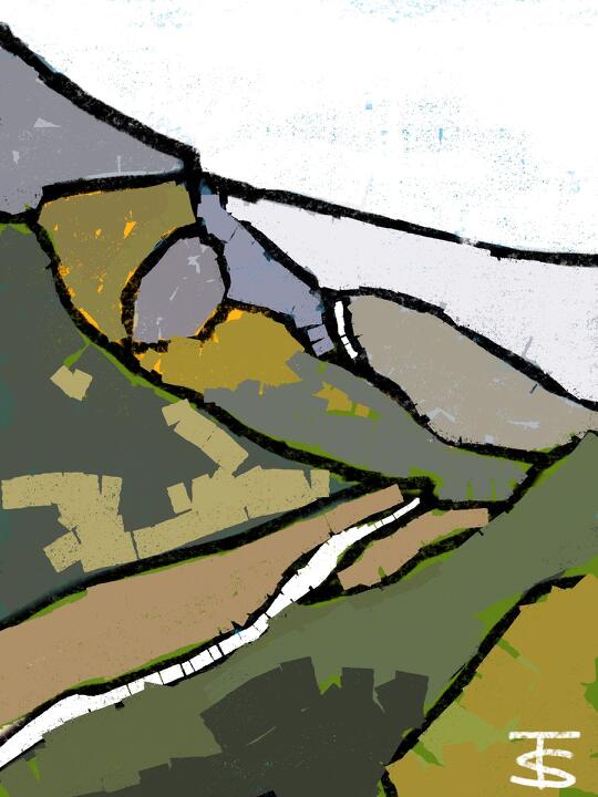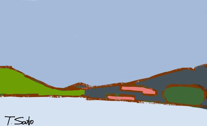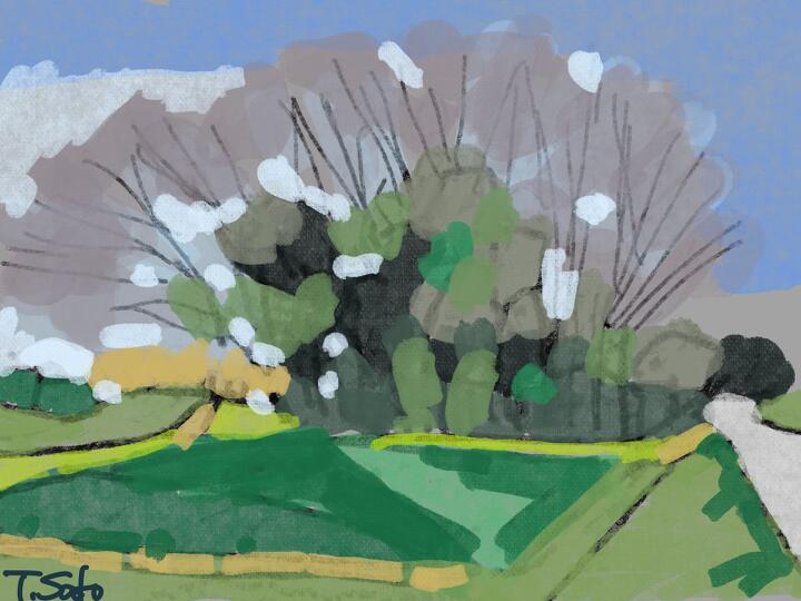 34 early spring,Satoyamajujo 2017年3月、南魚沼「里山十帖」のアクティビティで。遠くに魚沼市街。- Procreate,nicholas