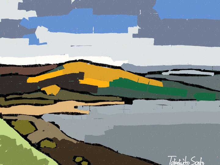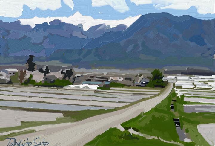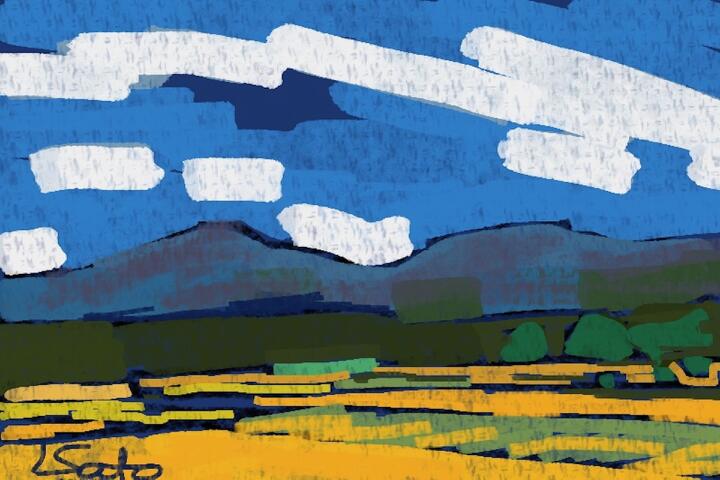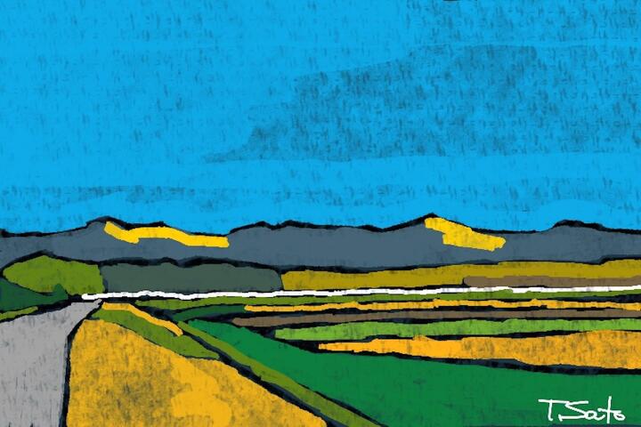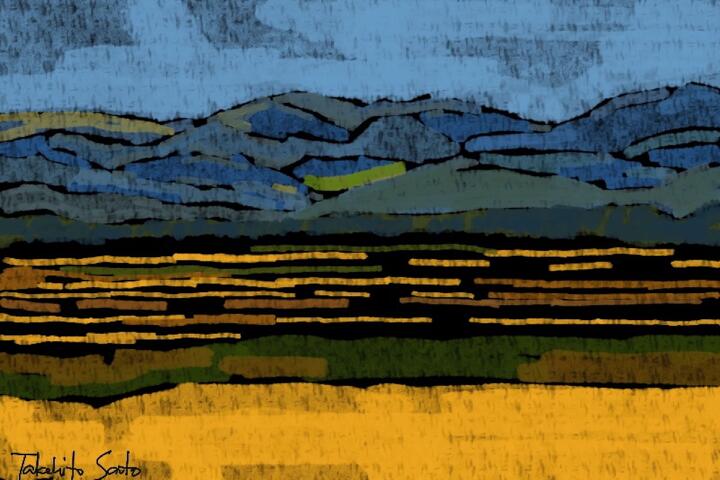 281 Mt. Yunomaru from Mt.Iitsuna Park 小諸市飯綱山公園から湯の丸高原方面の山々と秋の田んぼ -Procreate / Oil pastel,Oberon