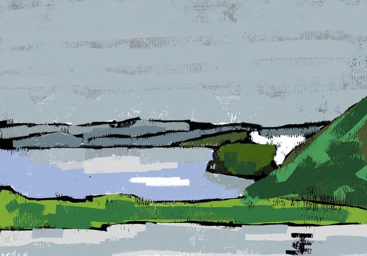 45 View from Kurumayama 2013年8月、車山中腹からの白樺湖。奥の山は蓼科山。- Procreate,Dryink,Moorilla
